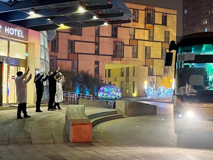 2月12日大(da)年(nian)初一(yi)(yi)夜(ye)里,正當(dang)人(ren)們闔家(jia)團聚喜迎新春之時(shi),華(hua)騰(teng)美(mei)居酒(jiu)(jiu)店(dian)(dian)干部(bu)員工卻以(yi)“歡送”的(de)方(fang)式迎接這一(yi)(yi)喜慶時(shi)刻(ke)的(de)到來(lai)。此(ci)時(shi)的(de)華(hua)騰(teng)美(mei)居酒(jiu)(jiu)店(dian)(dian)大(da)堂門前,北化房地產(chan)公司黨總支委員、副總經理、美(mei)居酒(jiu)(jiu)店(dian)(dian)負責人(ren)白江正與酒(jiu)(jiu)店(dian)(dian)管理人(ren)員一(yi)(yi)起(qi)守候在(zai)門口,向魚貫而出的(de)人(ren)們揮手告(gao)別,目送他們踏上回家(jia)的(de)大(da)巴車。同樣(yang)的(de)一(yi)(yi)幕(mu)在(zai)次日的(de)大(da)年(nian)初二夜(ye)里再次上演。至此(ci),262名隔離人(ren)員在(zai)華(hua)騰(teng)美(mei)居酒(jiu)(jiu)店(dian)(dian)完(wan)成21天隔離觀察,并經核酸(suan)檢測為(wei)陰性后,于(yu)2月12、13日大(da)年(nian)初一(yi)(yi)和初二夜(ye)里,分兩(liang)批(pi)全部(bu)踏上了返(fan)家(jia)的(de)路途。
