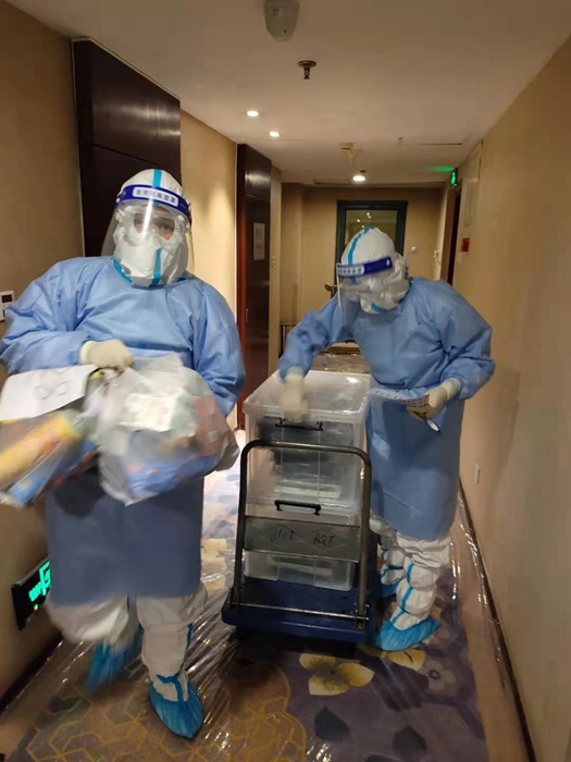 穿(chuan)戴嚴密(mi)防護(hu)服的他們(men),每(mei)天都要在嚴格消殺的基礎(chu)上,完(wan)成(cheng)(cheng)早中晚三(san)輪(lun)的餐食(shi)配送,然后(hou)再完(wan)成(cheng)(cheng)三(san)輪(lun)的物(wu)資配送。此外,每(mei)天深夜時分,他們(men)還要在嚴格消殺后(hou),完(wan)成(cheng)(cheng)隔離區(qu)垃圾收納(na)工作。262人分布在不同(tong)樓層,每(mei)人都要配送到位,收納(na)到位,每(mei)一輪(lun)工作結束后(hou),他們(men)都已經(jing)累得氣喘吁(yu)吁(yu)、渾身(shen)濕(shi)透……