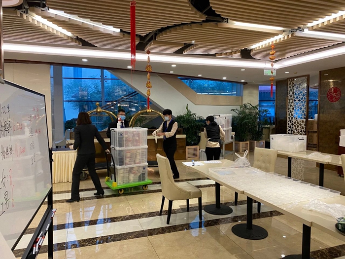 接到通知時(shi),離(li)具(ju)備接待條(tiao)件已不(bu)足24小(xiao)時(shi),北(bei)(bei)京化(hua)工集(ji)團黨(dang)委當即進行部署,軍(jun)令如山,華騰美居酒店(dian)(dian)上級(ji)單位——北(bei)(bei)化(hua)房地產(chan)公(gong)司,第一時(shi)間成立了以公(gong)司黨(dang)總支書記(ji)、董事長(chang)王強(qiang),黨(dang)總支副書記(ji)、總經理鄭冰(bing),黨(dang)總支委員、副總經理、美居酒店(dian)(dian)負(fu)責(ze)人白(bai)江為(wei)負(fu)責(ze)人的隔離(li)服務領導小(xiao)組,下設多個專(zhuan)業服務組,全(quan)面部署酒店(dian)(dian)改造和接待工作(zuo)。“大戰”在即,王強(qiang)強(qiang)調,各黨(dang)支部要充分發揮戰斗堡(bao)壘作(zuo)用,黨(dang)員要發揮模范帶頭作(zuo)用,在這(zhe)次關(guan)系全(quan)市疫情防控(kong)大局(ju)的工作(zuo)中勇于沖鋒、敢于擔責(ze),激(ji)發起(qi)廣大員工凝聚力、戰斗力,高標準(zhun)完成這(zhe)一光榮任務。